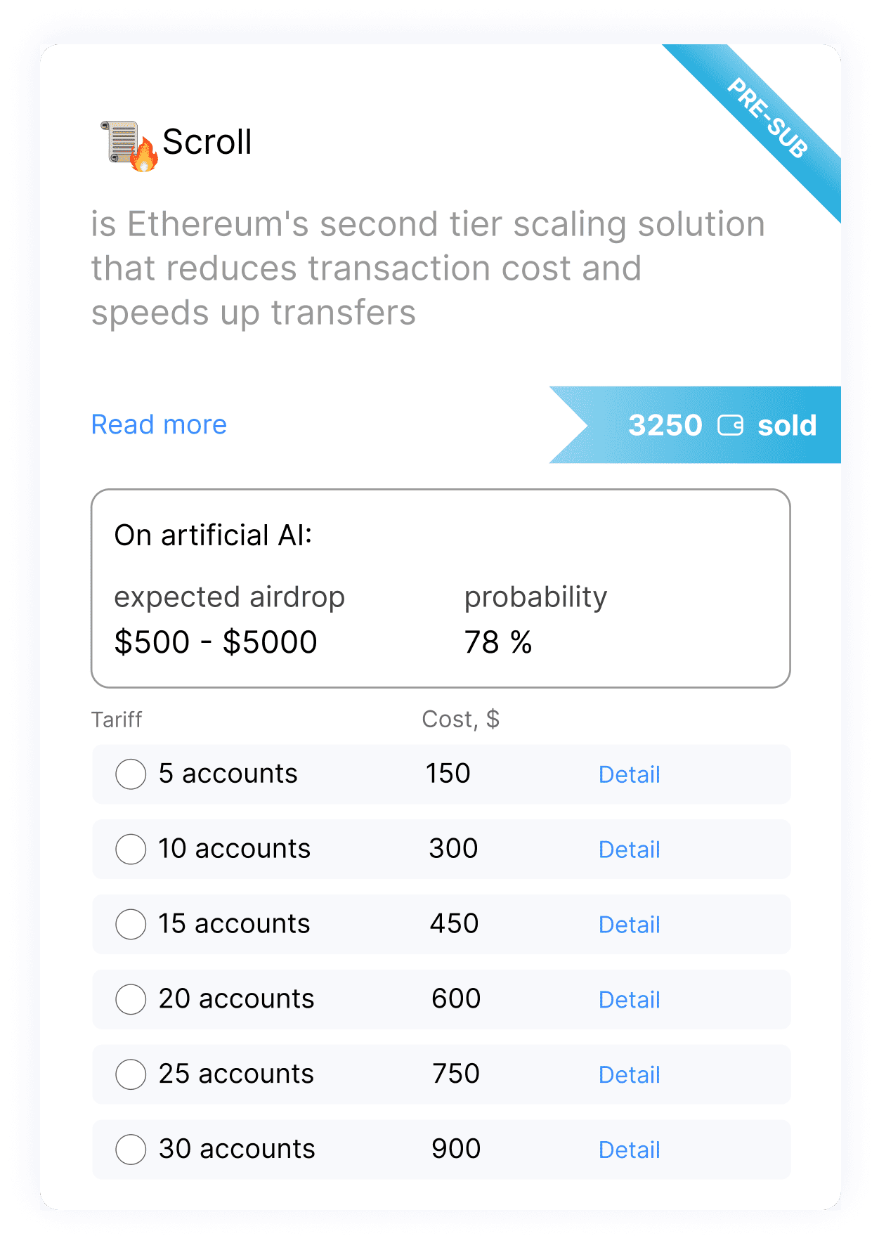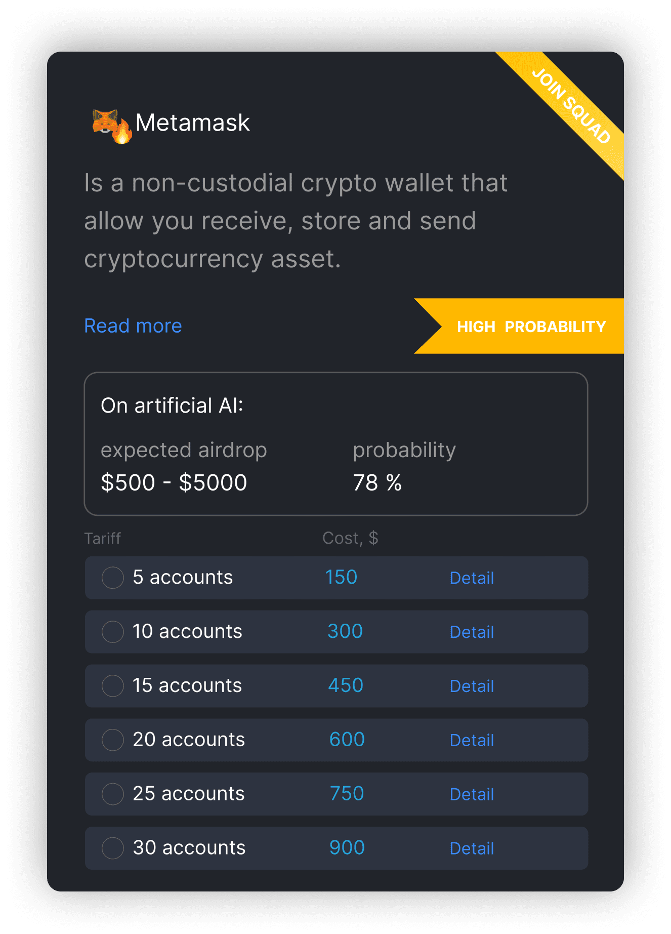 AI AirdropHunter Tired of KYC, being a sybil and not receiving airdrops? Especially for you, with the help of breakthrough AI technologies, we have developed a system for selecting cards and knocking out activities, which increases the likelihood of receiving an airdrop on a new bullish cycle!